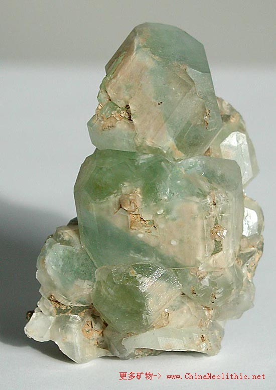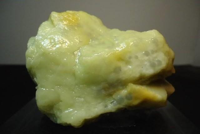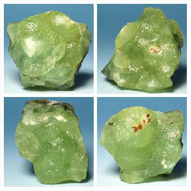 【19】葡萄石。晶质体,常葡萄状、呈板状、肾状、块状、片状、放射状。有玻璃样光泽。硬度为6—6.5,密 度为2.80g/cm3—2.95g/cm3。折 射 率为1.616—1.649。