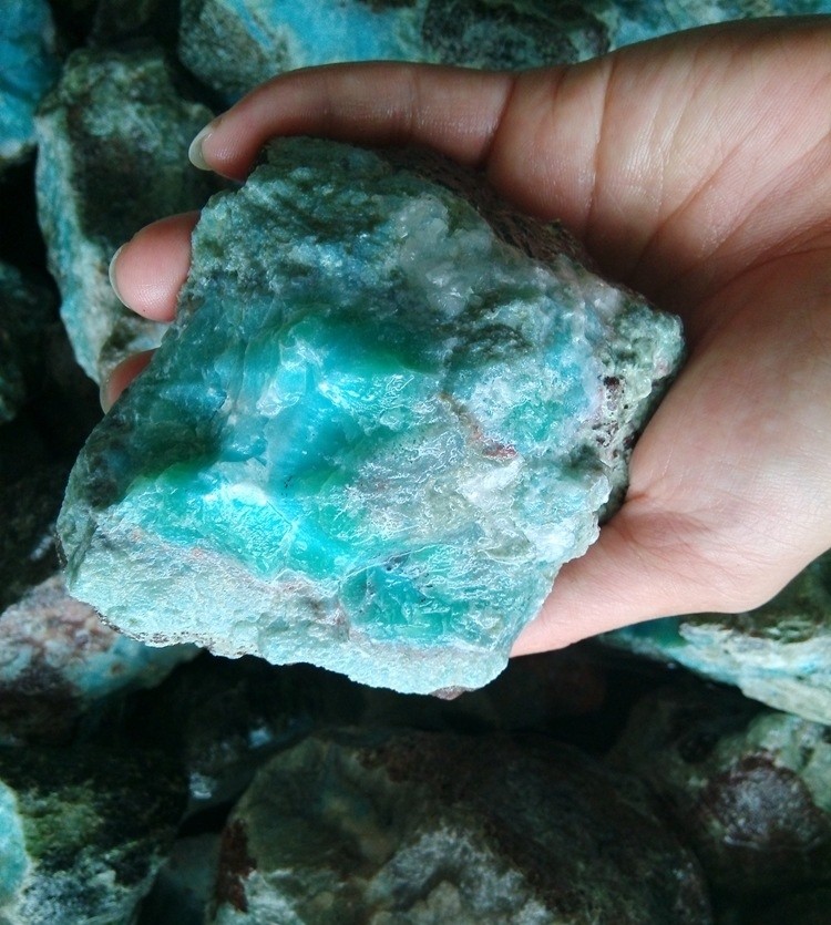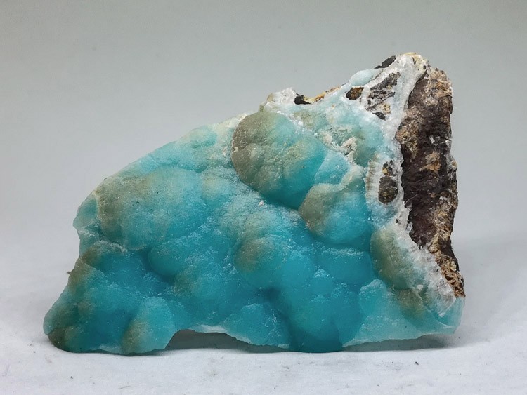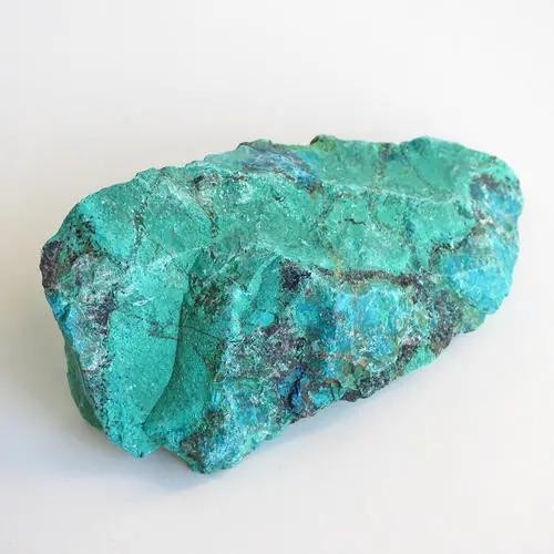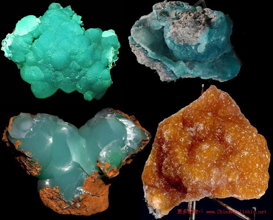 【18】硅孔雀石。隐晶质,呈皮壳状、钟乳状和土状,呈玻璃光泽、蜡状光泽,陶瓷外观。硬度为2—4,有时达到6,折 射 率为1.50左右。