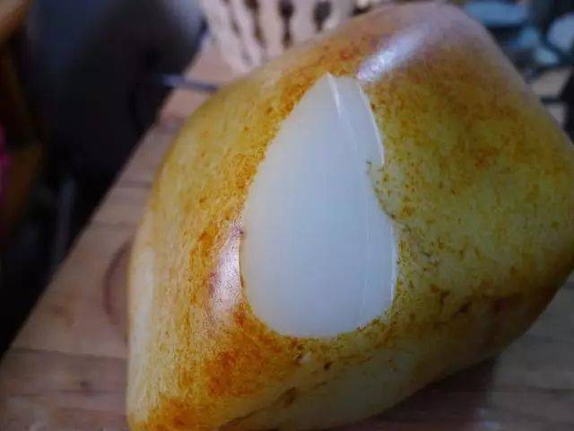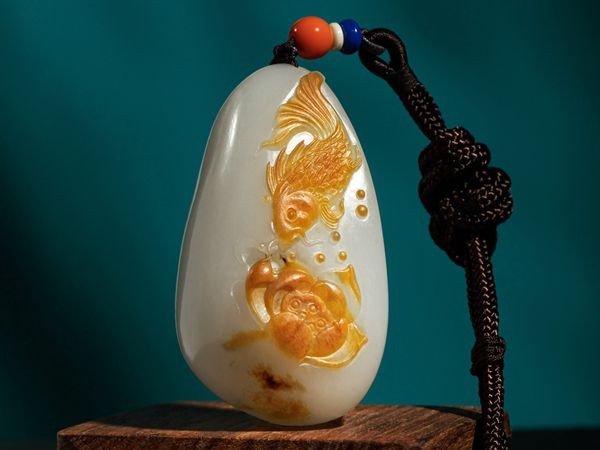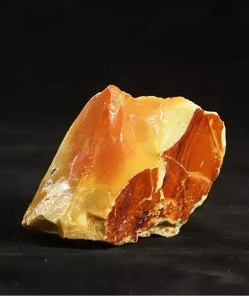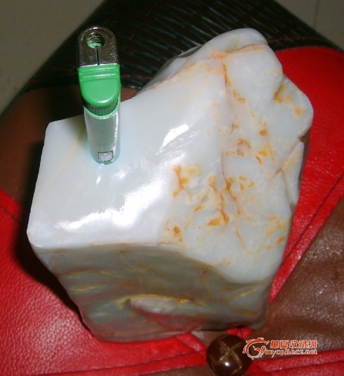 【34】寿山石,又叫田黄。矿物名称叫高岭石、叶蜡石等。隐晶质鳞片状,田黄状条纹。油脂光泽、蜡状光泽。断口呈贝壳状。硬度为2—3,密度为2.5g/cm3—2.7 g/cm3,折 射 率为1.56。