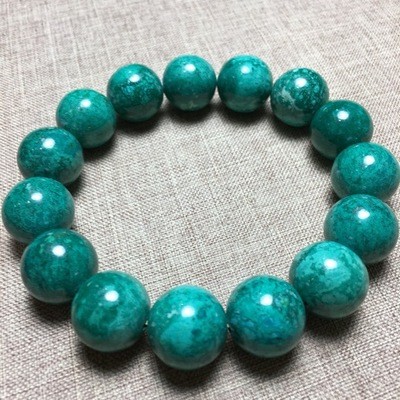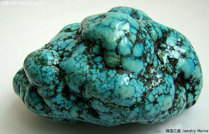 【15】绿松石。隐晶质集合结构,多呈块状、皮壳状体。具有玻璃光泽、蜡状光泽。硬度为5—6。密 度为2.76g/cm3,折 射 率为1.61。