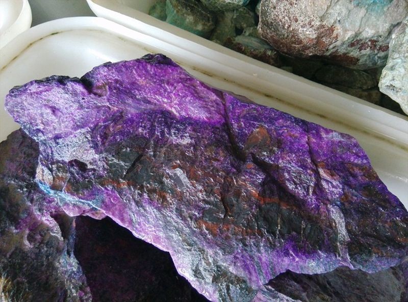 【10】查罗石。主要矿物是紫硅碱钙石,含长石、硅钛钙钾石、霓辉石等。晶质集合结构,有纤维状、块状。硬度为5—6。密 度为2.68g/cm3,折 射 率为1.550—1.559,有蜡状光泽、玻璃光泽。