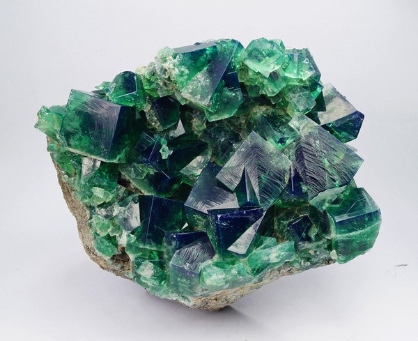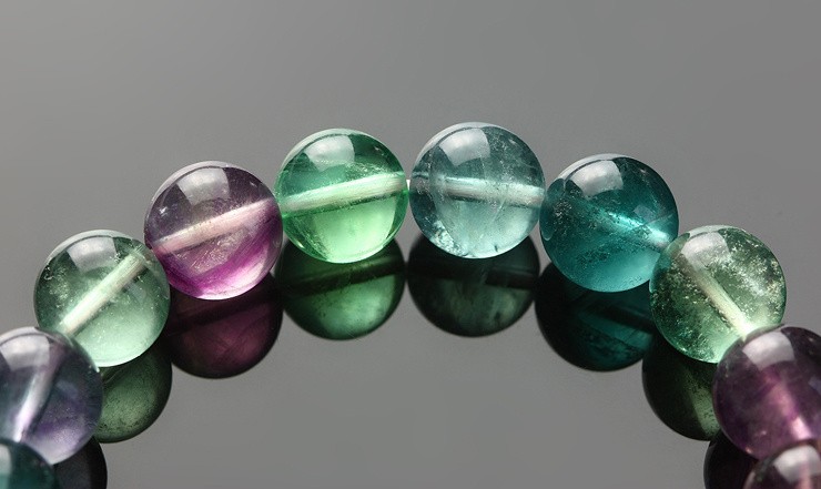 【25】萤 石。常见有色带、两相、三相,绿、黄、蓝、紫、粉等。具有玻璃光泽。硬度为4,密 度为3.18g/cm3。紫外有很强荧光,有些有磷光。