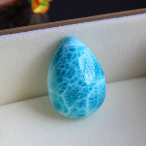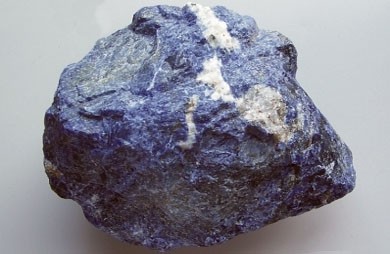 【30】方钠石。晶质体结构,放大看见有白色脉,具有油脂或玻璃光泽,硬度为5—6,密 度为2.2/cm3,折 射 率为1.483。碰到盐酸会侵蚀。