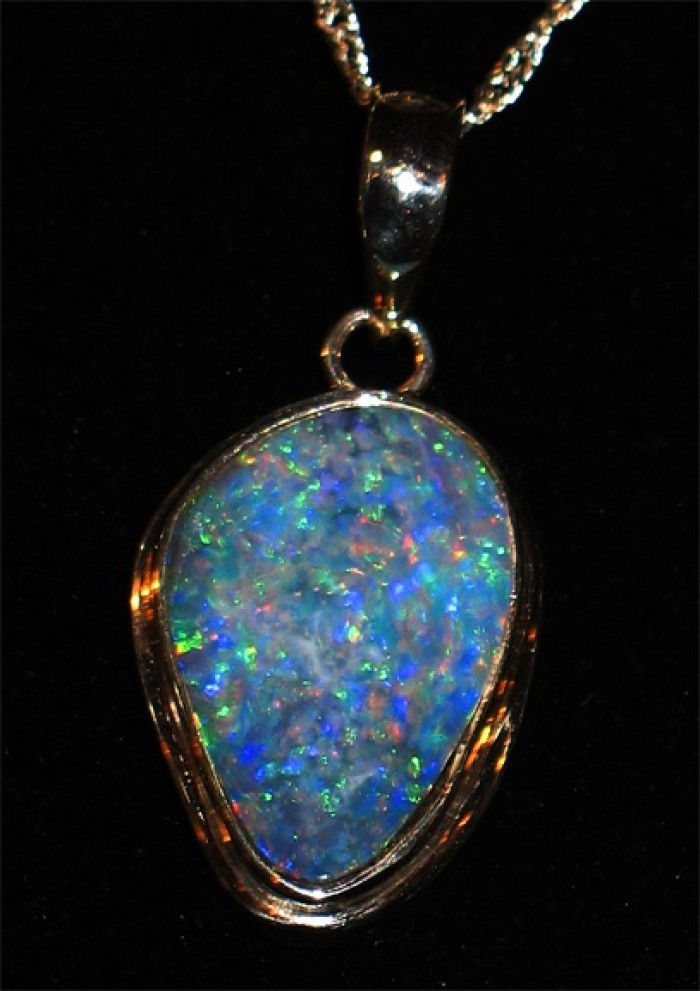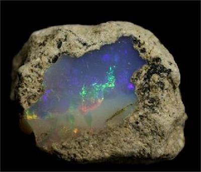 【3】欧泊,又称蛋白石。为非晶质体。硬度为5—6,密度为2.15g/cm3。折 射 率为1.42—1.43。常呈树脂光泽、玻璃光泽,特殊照射时有变彩效应。