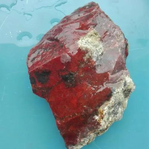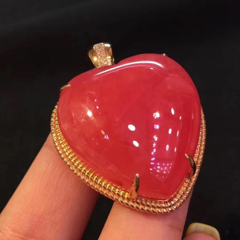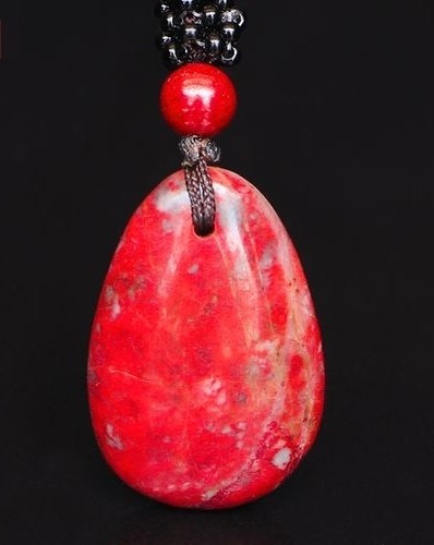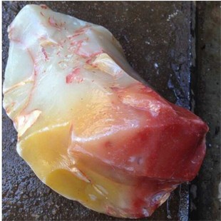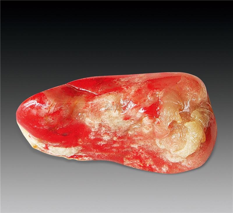 【33】鸡血石。矿物为:地开石、高岭石、辰砂、叶蜡石。晶质块状、微细粒,玻璃光泽、蜡状光泽。硬度为2—3,密度为2.53g/cm3—2.68 g/cm3,折 射 率为1.56。