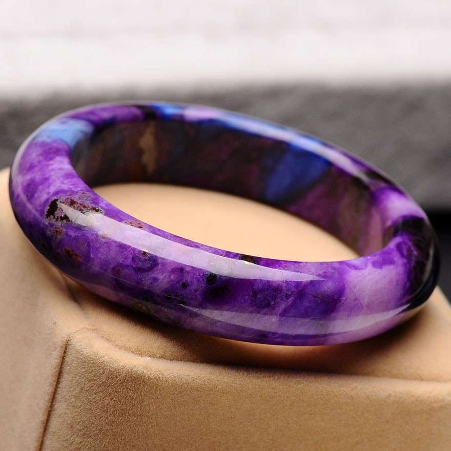 【37】苏纪石。矿物名称叫硅铁锂钠石。晶质集合。玻璃、腊状光泽。硬度为5.5—6.5,密度为2.74g/cm3 ,折 射 率为1.61。