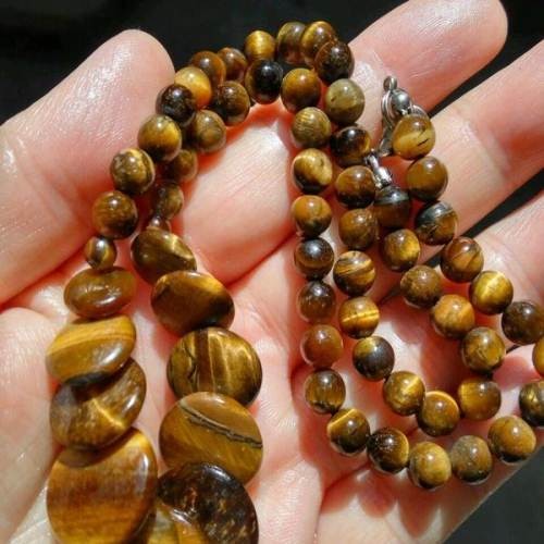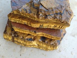 【6】木变石,又称鹰眼石、虎睛石,)。为隐晶质、显晶质石英,含有针铁矿、钠闪石、赤铁矿等。纤维状、粒状结构。硬度为7,密 度为2.64g/cm3—2.71g/cm3,折 射 率为1.53 —1.54。有褐黄、灰蓝、金黄、绿蓝等色,以褐黄、金黄为主色的称“虎睛石”,以绿蓝、灰蓝为主调的称“鹰睛石”。有玻璃光泽、丝绢光泽、蜡状光泽,有猫眼的效应。