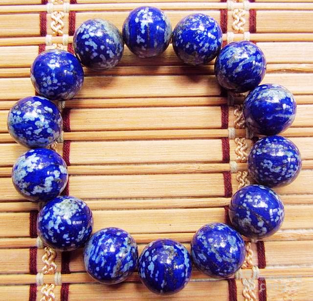 【16】青金石。主要有青金石、蓝方石、方钠石、黄铁矿、方解石、云母、透辉石、角闪石等。晶质结构,具有蜡状光泽、玻璃光泽。硬度为5—6。密 度为2.75g/cm3,折 射 率为1.50,有时可达1.67。