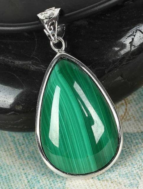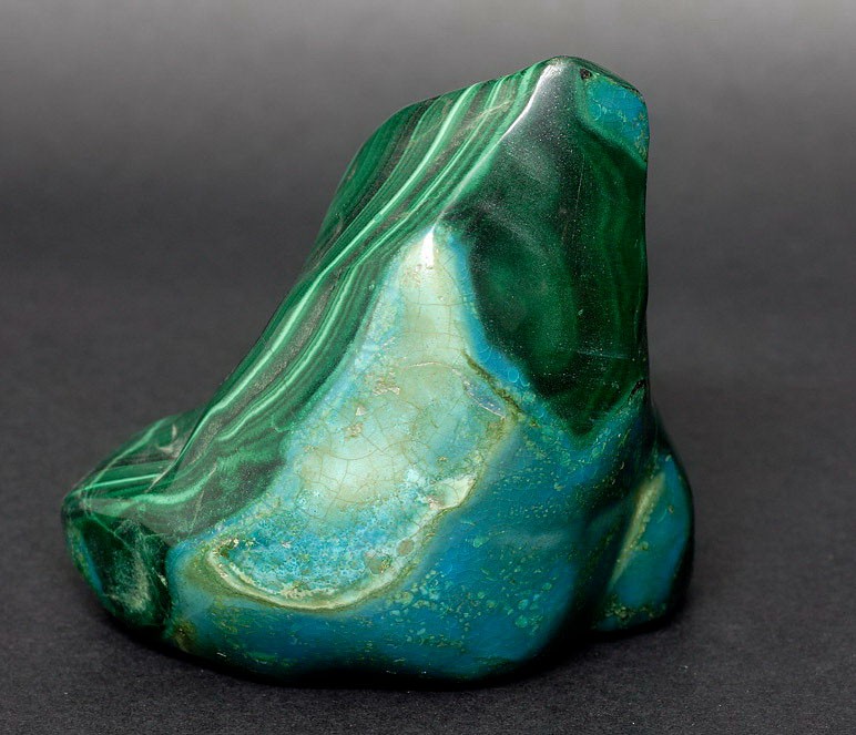 【17】孔雀石。晶质,纤维状、皮壳状、条纹状结构。玻璃光泽、丝绢光泽。硬度为3.5—4。密 度为3.95g/cm3。