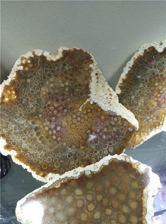 【20】硅化珊瑚。石英的一种。隐晶质和显晶质石英,半透明到不透明。结构为粒状、纤维状,有灰白、橙红、黄白、黄褐色。呈蜡状光泽、玻璃光泽。