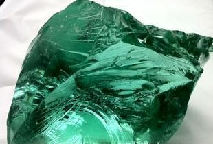 【32】天然玻璃,又称陨石玻璃、或火山玻璃(黑曜岩)。放大镜看有圆形、拉长气泡。呈现玻璃样光泽。硬度为5—6,折 射 率为1.490。