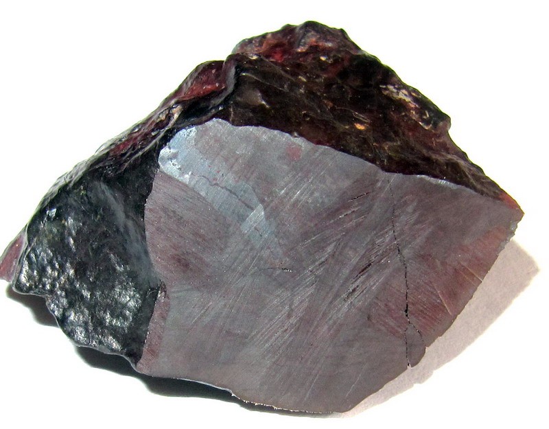 【31】赤铁矿。晶质集结构,块状、放射状、粒状。金属样的光泽,断口为锯齿状,硬度为5—6,密 度为5.20g/cm3,折 射 率为2.94—3.220。新断口呈现红褐色。