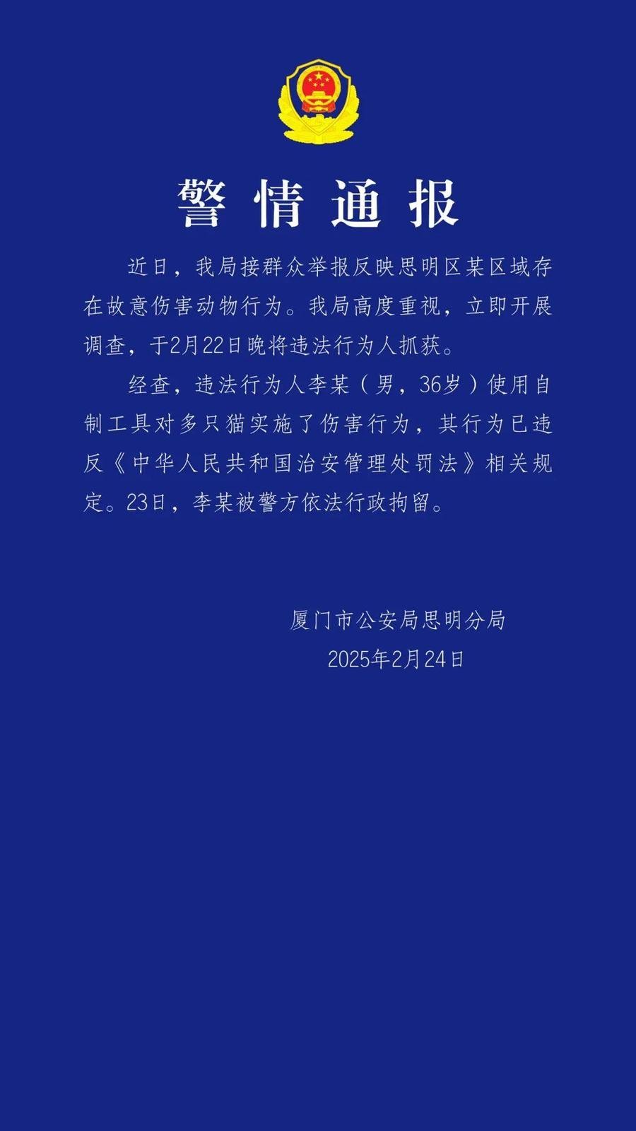 2月24日,厦门市公安局思明分局发布《警情通报》:近日,我局接群众举报反映思明区某区域存在故意伤害动物行为。我局高度重视,立即开展调查,于2月22日晚将违法行为人抓获。