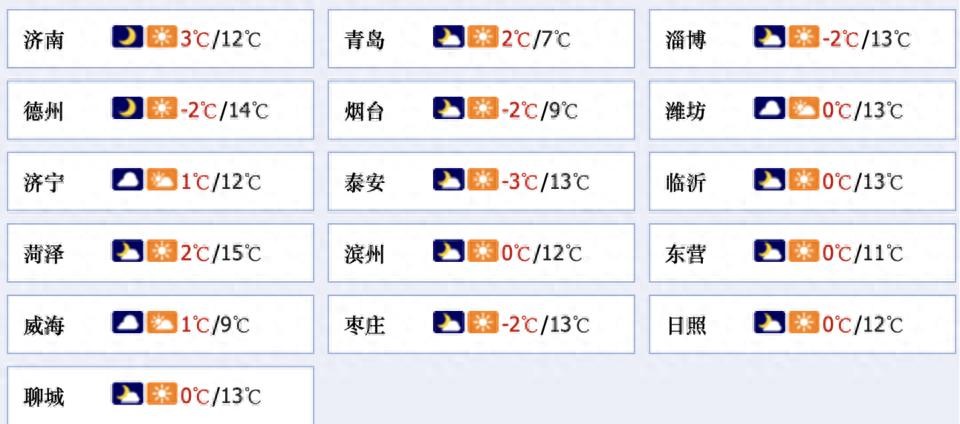 最低气温:菏泽和鲁西北地区1℃左右,鲁中山区和半岛内陆地区-3℃左右,其他地区-1℃左右。