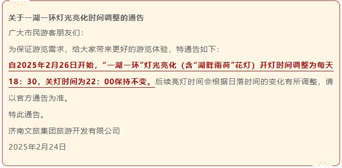 自2025年2月26日开始,济南“一湖一环”灯光亮化(含“湖畔雨荷”花灯)开灯时间调整为每天18:30,关灯时间为22:00保持不变,请市民和游客注意时间调整。