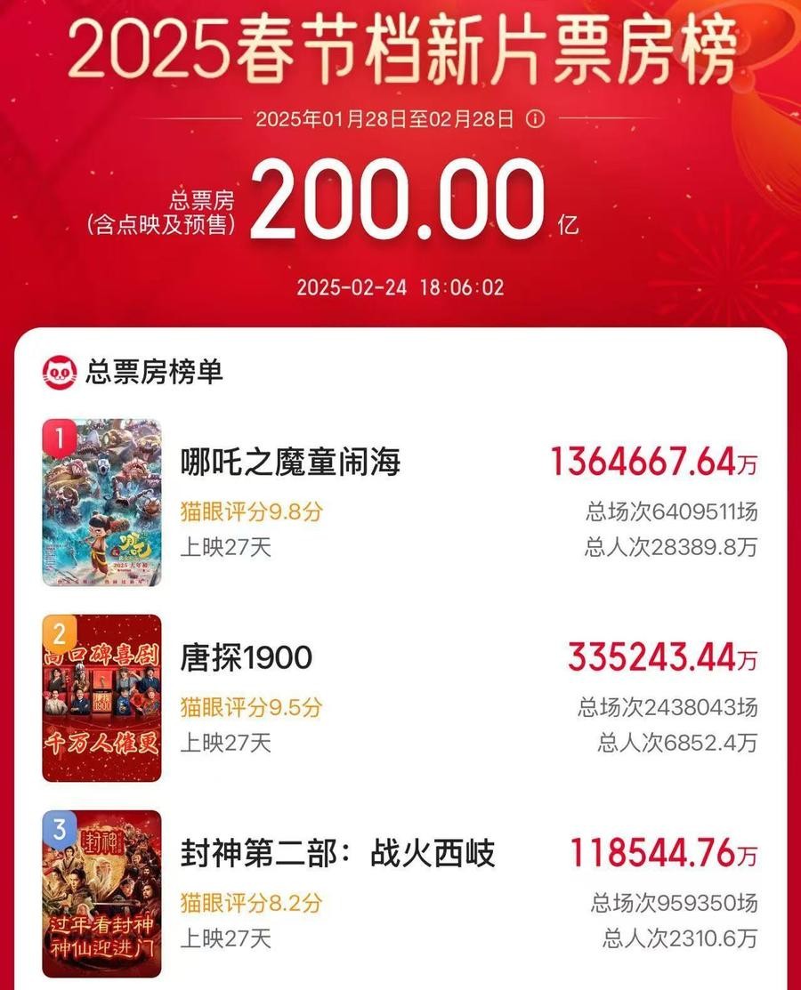 据网络平台数据,2025年2月24日18时,2025春节档上映新片总票房(含预售)突破200亿!其中《哪吒之魔童闹海》含预售总票房超136亿。