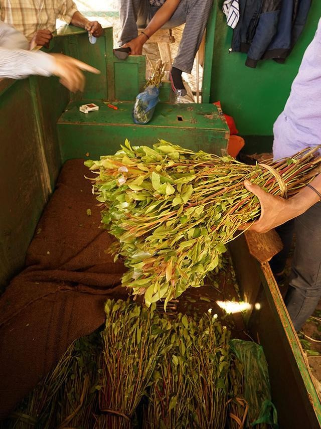 他们会花去5美金到39美金价格,从商家手里购买包装好的卡特叶放入嘴里,一边咀嚼一边聊天,等待快感的降临。