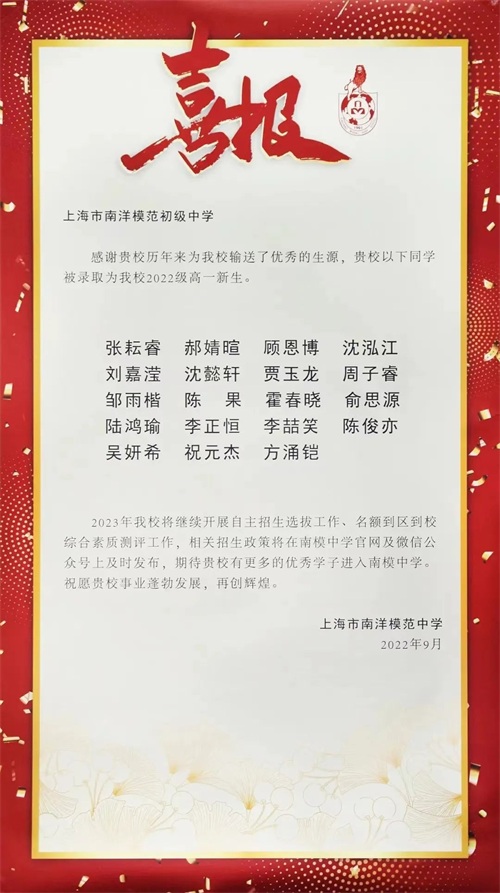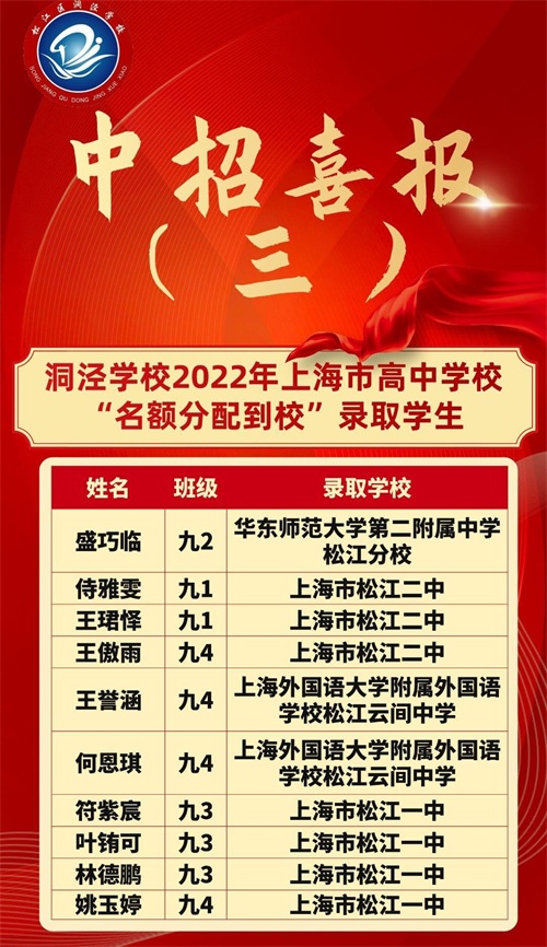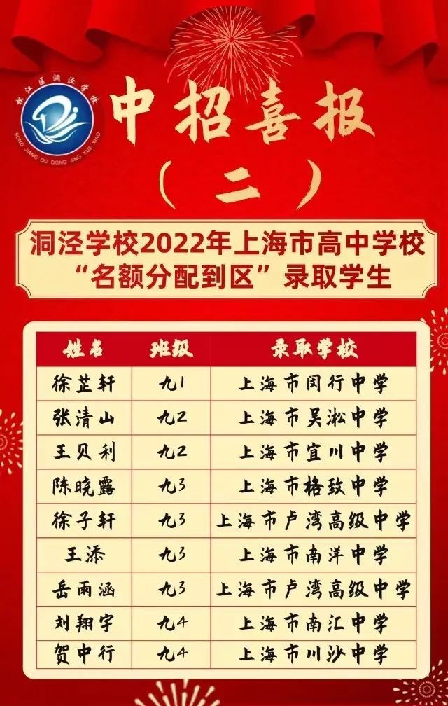 其中录取于上海中学1人,上海师范大学附中1人,华二紫竹4人,交大闵分4人,上师大闵分4人,七宝中学7人,及其他各类市实验性示范高中29人。