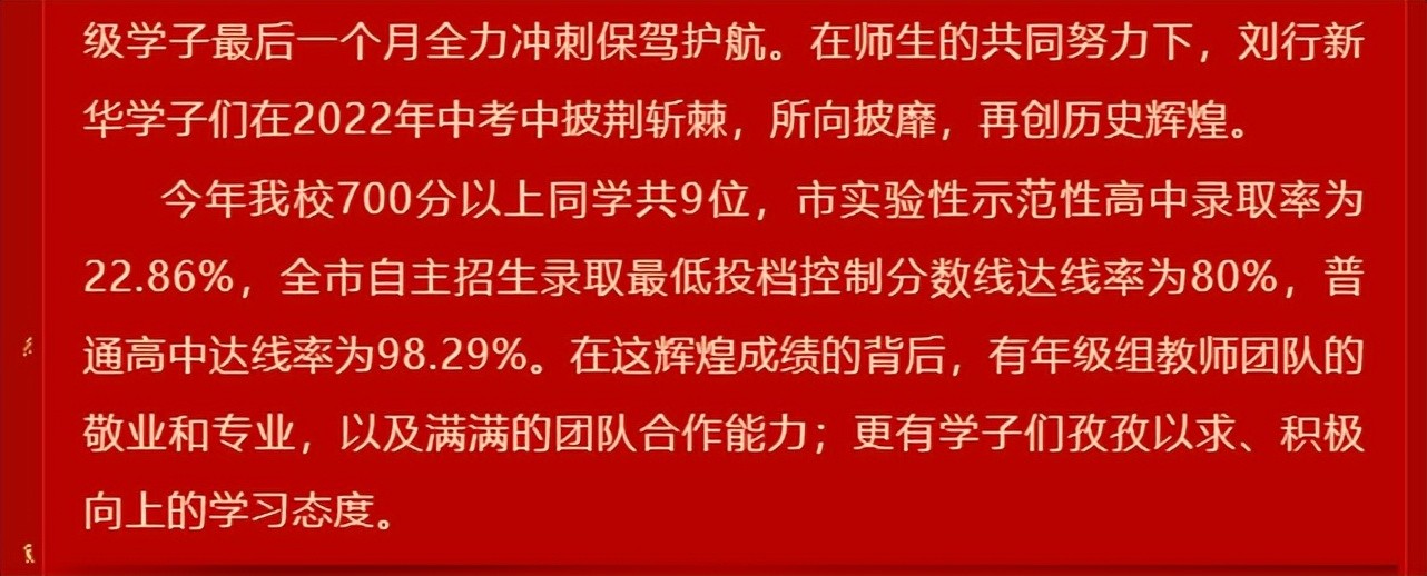 2022年,明星学校有112人参加中考,90人被高中学校录取,普高率高达80.4%(全市普高录取率只有64%)。其中,23人被市重点录取,38人被区重点录取学校,市重点+区重点录取率高达54.5%。