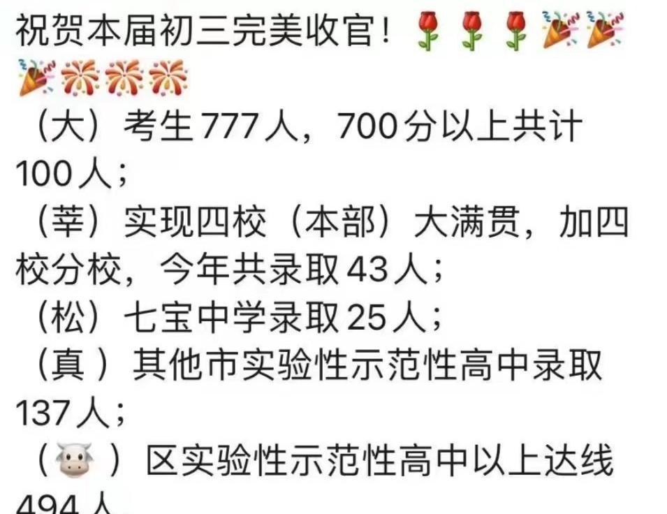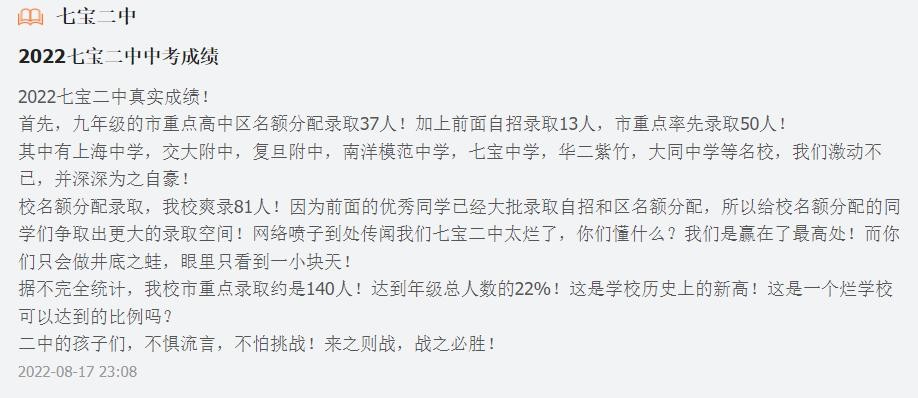 另外据网传,七宝二中名额分配录取81人,不完全统计,重点录取约是140人!达到年级总人数的22%!
