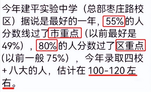 网传今年建平实验是录取最好的一年,55%的人过了市重分数线,80%的人过了区重分数线,四校八大录取大约在100-120人左右。