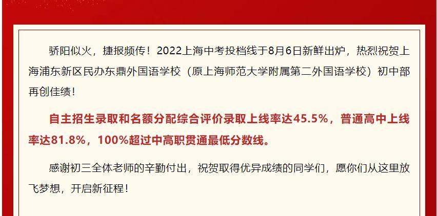 上海浦东新区民办东鼎外国语学校(原上海师范大学附属第二外国语学校)初中部再创佳绩!自主招生录取和名额分配综合评价录取上线率达45.5%,普通高中上线率达81.8%,100%超过中高职贯通最低分数线。