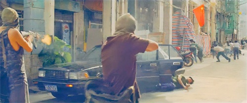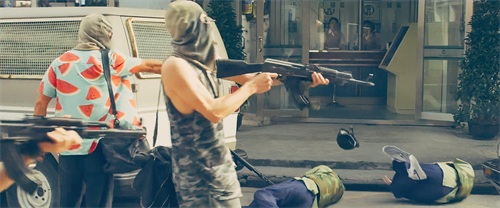 十多个警察对着门口的歹徒一番射击,两歹徒双手一抬,借着街边的绿化带掩护,四把“黑星”硬气还击一番。