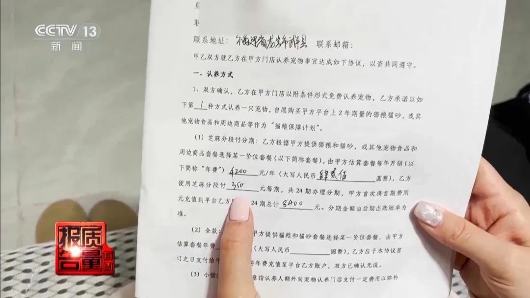 有着同样遭遇的不止刘女士一个人。上海市的苏先生在宝安区的一家宠物认养馆,签下了一份总计19200元的“宠粮月付”协议,月供800元,分为24期。领养到家之后,小猫也出现了猫癣、猫鼻支、耳螨等病症,只能自己掏钱治疗。